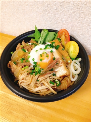 ボリュームたっぷりのうどんに甘めの牛すき焼きをのせた冷製うどんです。